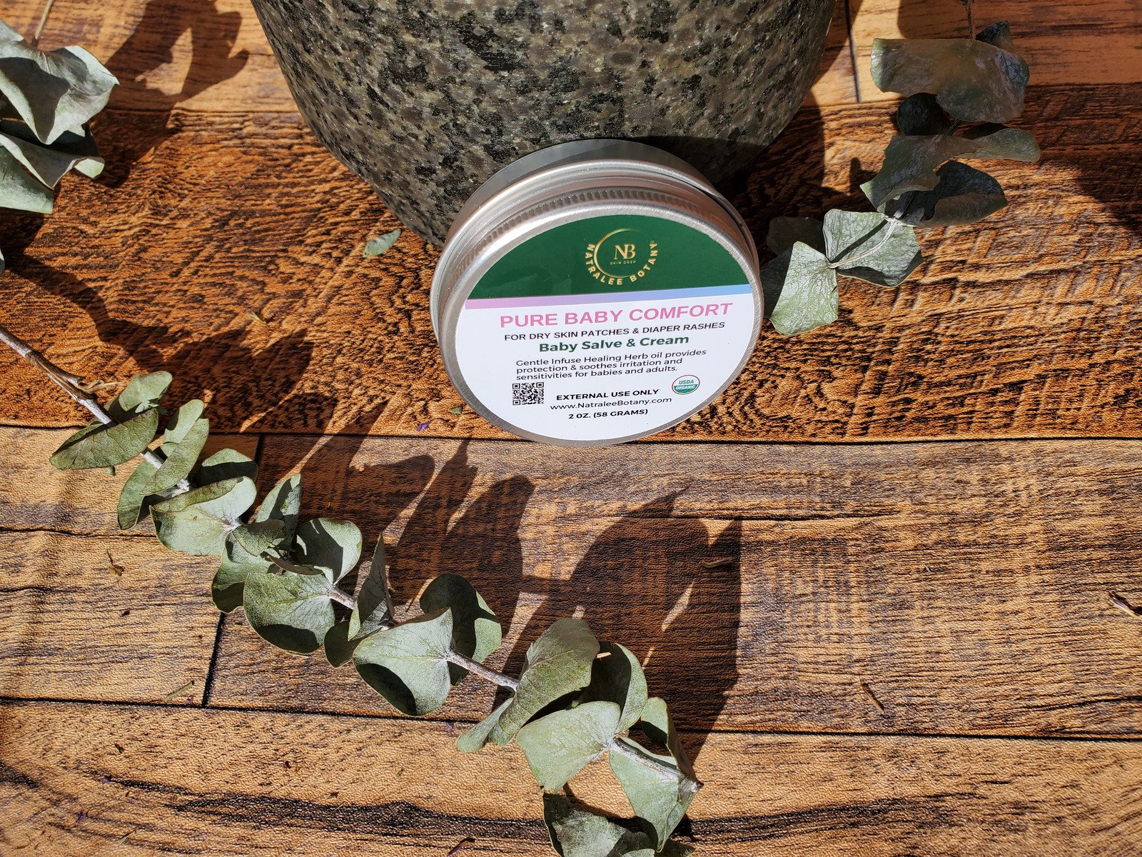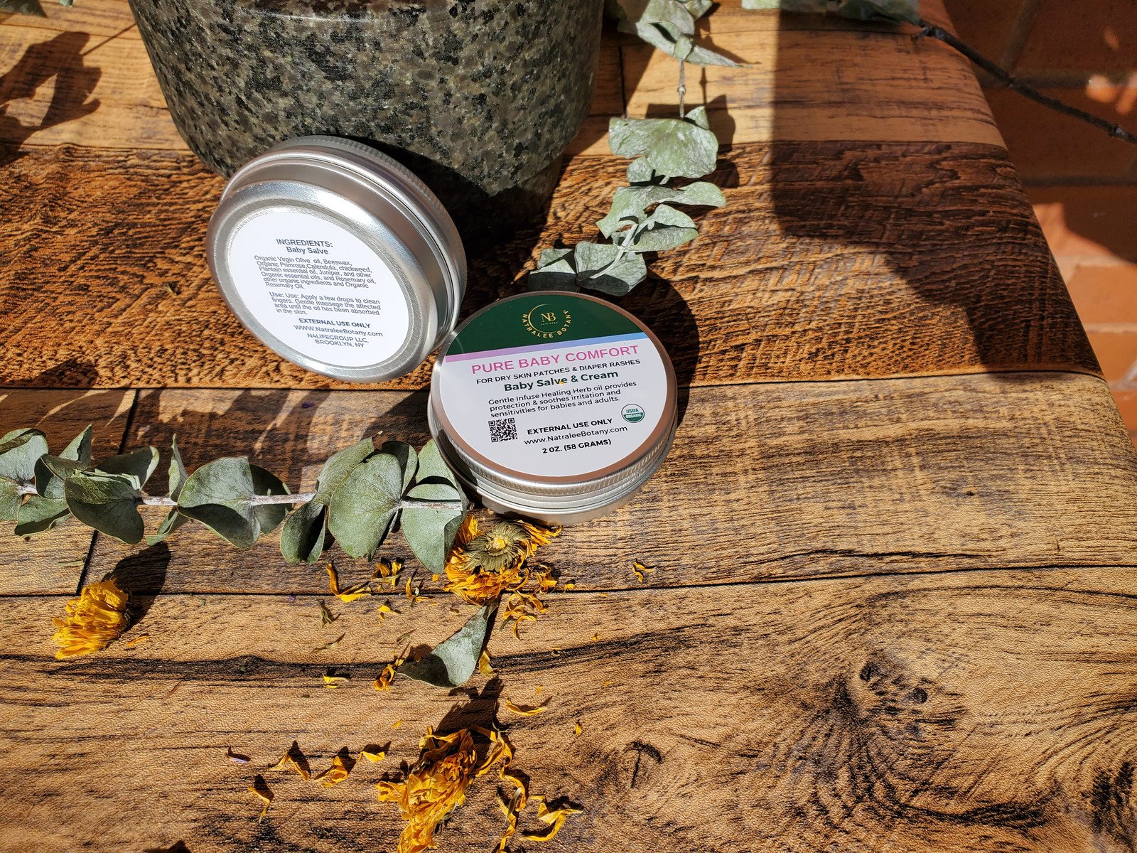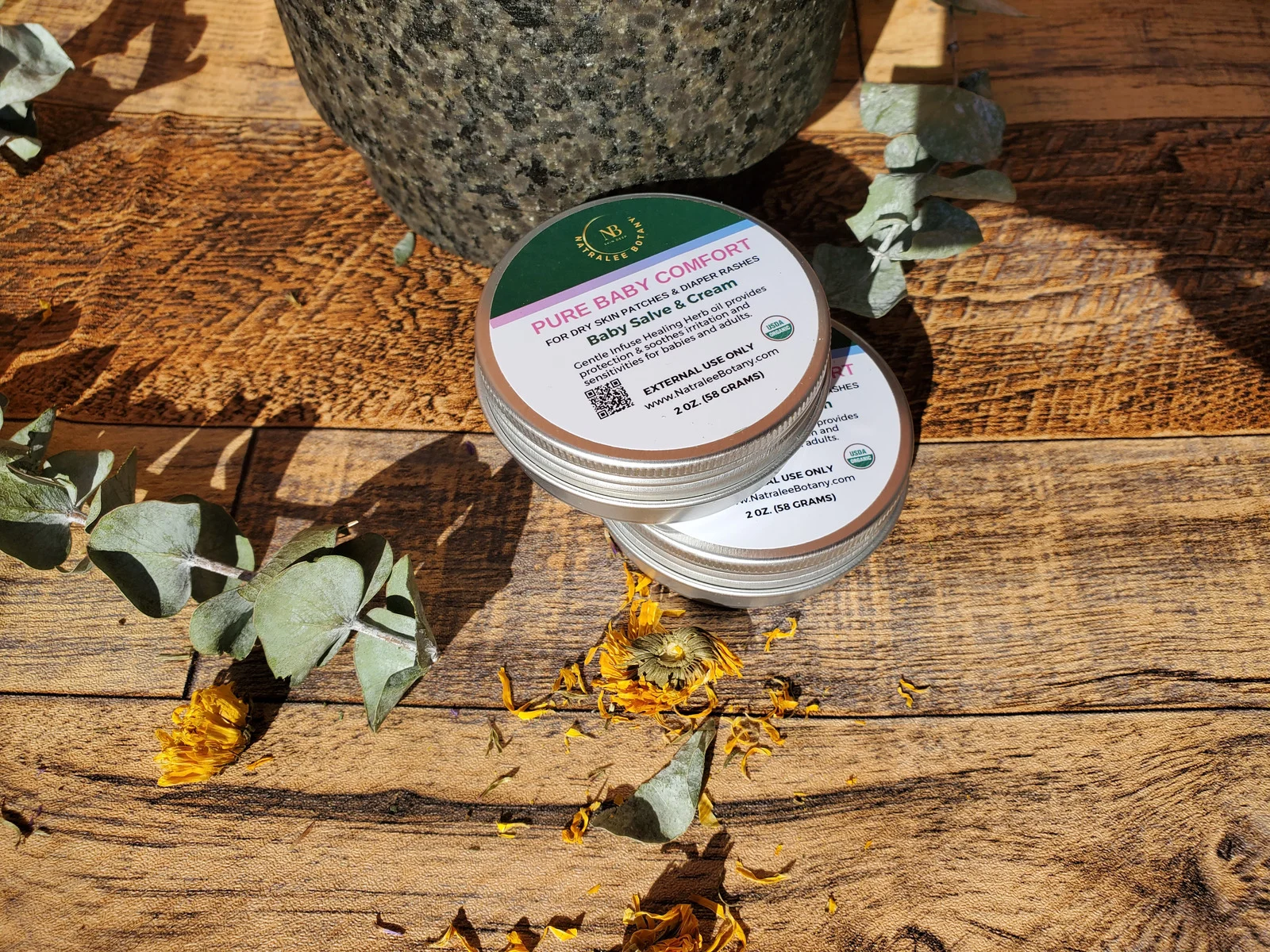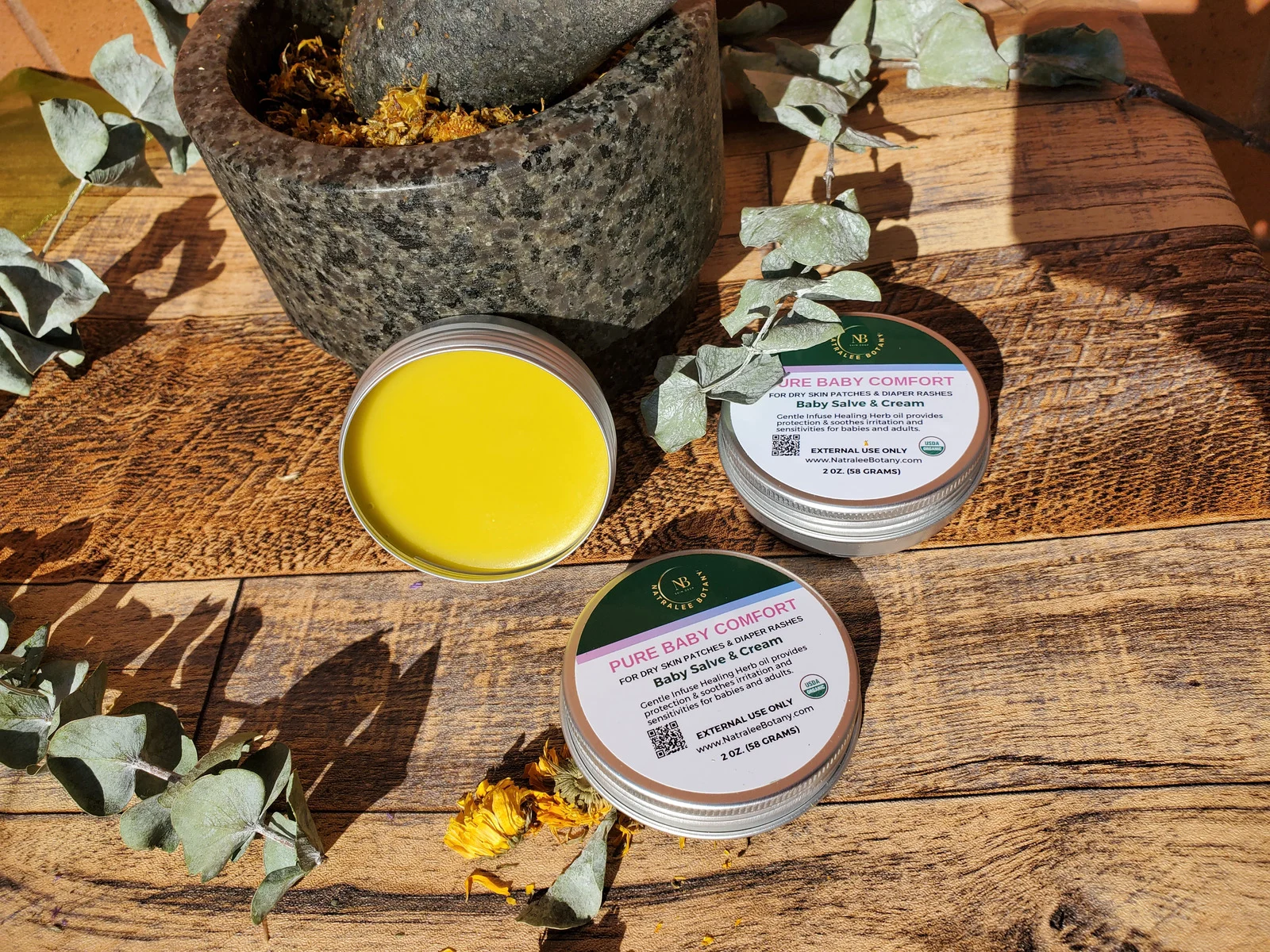 Our organic baby salve incorporates mild healing herbs, anti-inflammatory and antifungal myrrh, Extra virgin olive oil, and evening primrose oil. This blend ensures gentle yet effective protection, promoting soothing relief and calming for diaper rash and dry skin patches. Using our crafted infused herbal oils of calendula and other organic Botanicals, you will feel and see the differences in your skin.